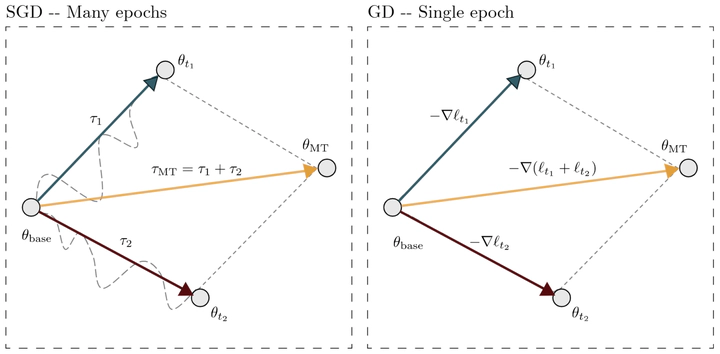 Task arithmetic has emerged as a simple yet powerful technique for model merging, enabling the combination of multiple finetuned models into one. Despite its empirical success, a clear theoretical explanation of why and when it works is lacking. This paper provides a rigorous theoretical foundation for task arithmetic by establishing a connection between task vectors and gradients of the task losses. We show that under standard gradient descent, a task vector generated from one epoch of finetuning is exactly equivalent to the negative gradient of the loss, scaled by the learning rate. For the practical multi-epoch setting, we prove that this equivalence holds approximately, with a second-order error term that we explicitly bound for feed-forward networks. Our empirical analysis across seven vision benchmarks corroborates our theory, demonstrating that the first-epoch gradient dominates the finetuning trajectory in both norm and direction. A key implication is that merging models finetuned for only a single epoch often yields performance comparable to merging fully converged models. These findings reframe task arithmetic as a form of approximate multitask learning, providing a clear rationale for its effectiveness and highlighting the critical role of early training dynamics in model merging.